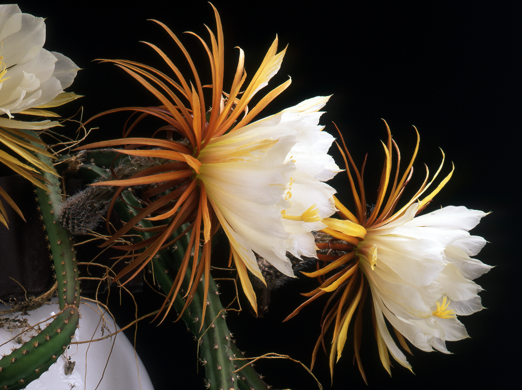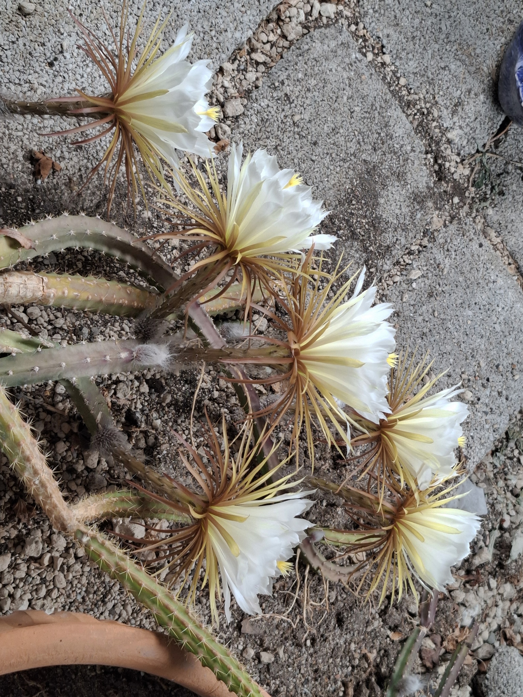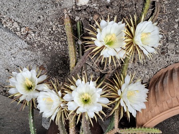 Selenicereusblüten an alten Trieben, sechs an der Zahl, die alle in einer Nacht erblühten