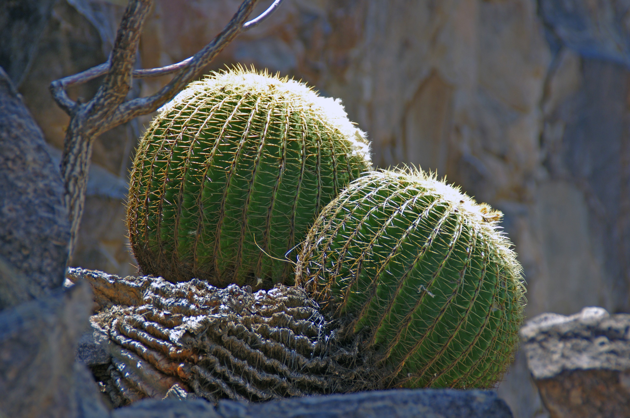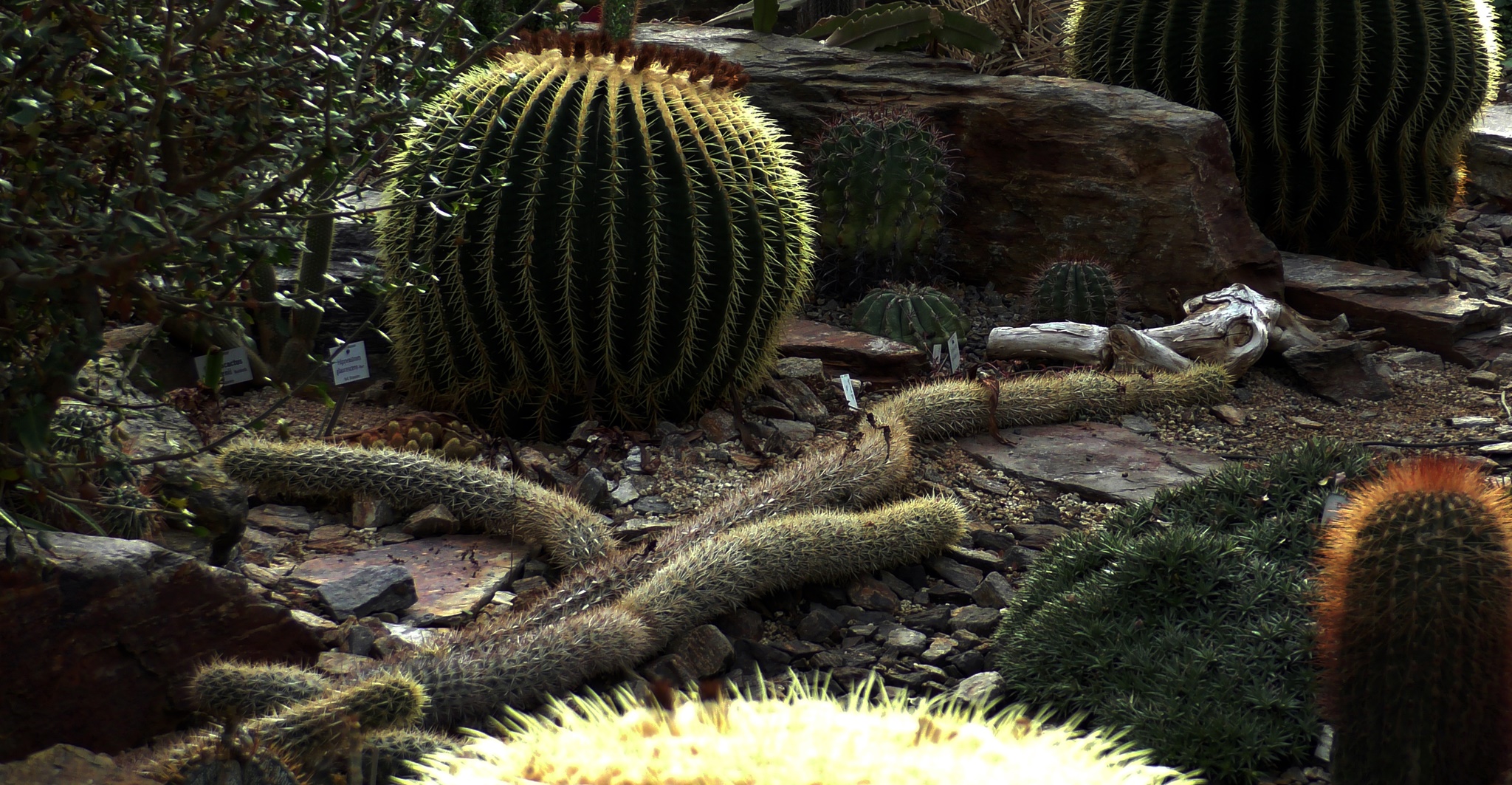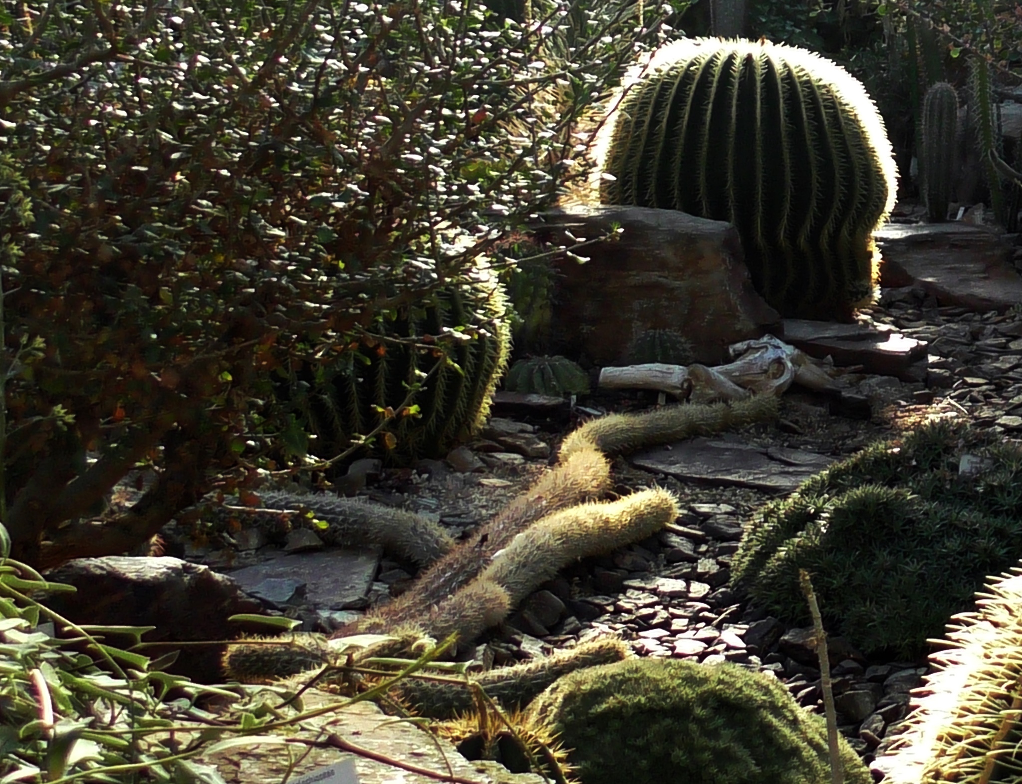 Der Boden ist sein Revier - Stenocereus eruca schlängelt sich zwischen den Echinocactus grusoniis im Botanischen Garten in München hindurch. Wäre interessant, was er tut, wenn er am Ende des Gewächshauses ankommt?