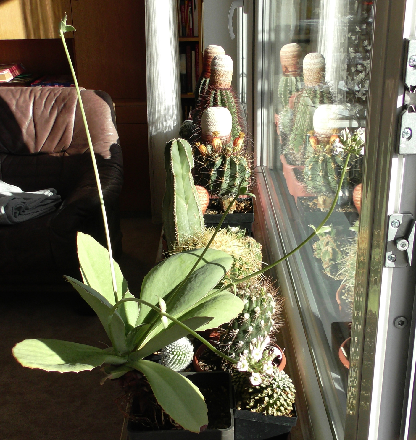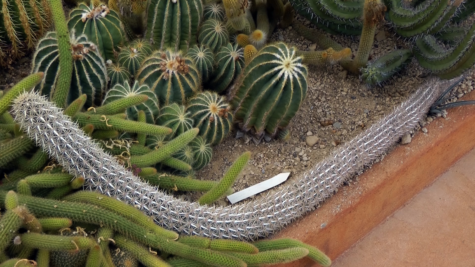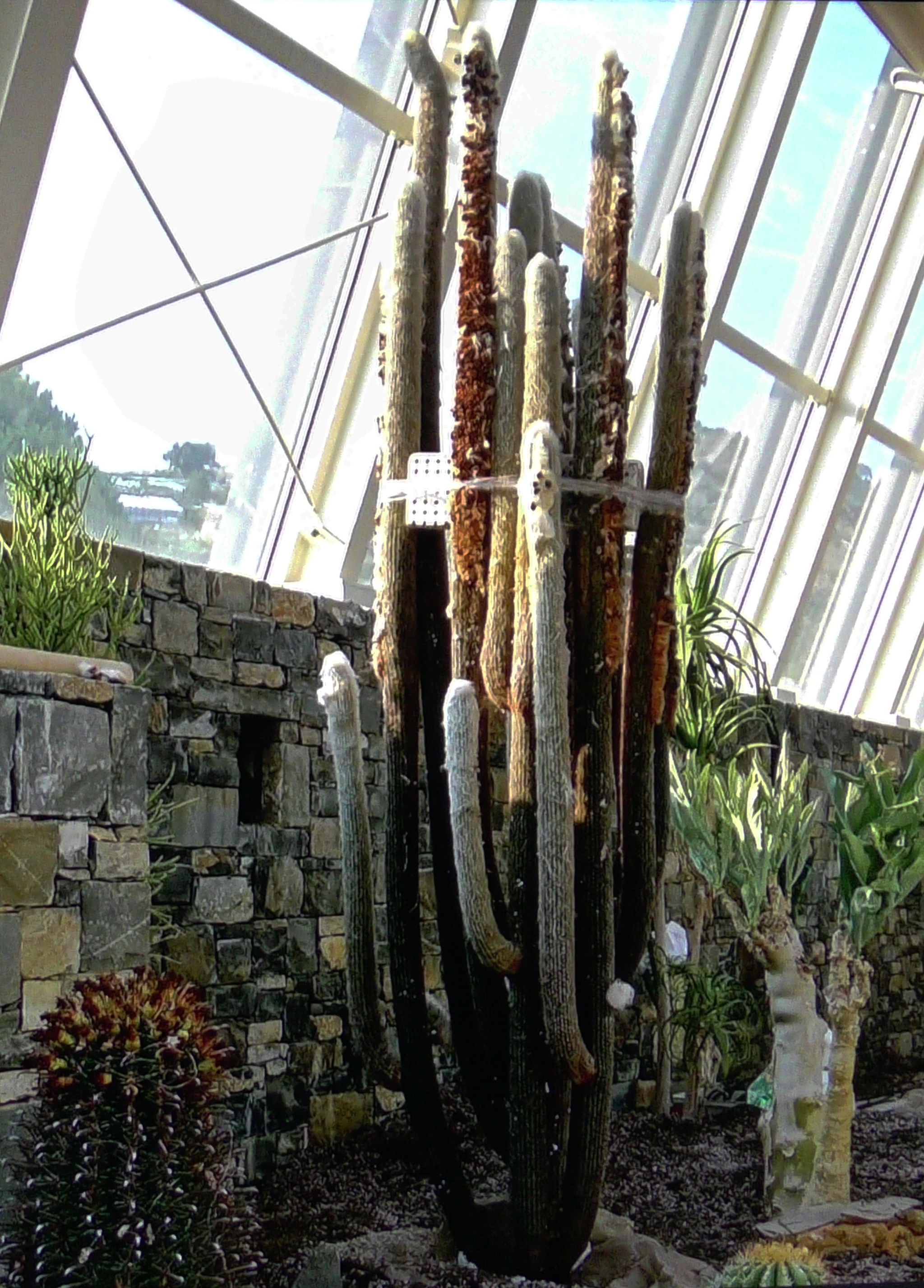 Jedes Jahr im Herbst fielen schön gewachsene Triebe des T. senilis um. Die in der warmen Gewächshausluft zu üppig gewachsenen Triebe entwickelten ein zu schwach ausgebildetes Leitbündel. Gleiches passierte mit einigen Cleistocactus strausii, dessen Säulen extrem bis zu 12 cm dick und bis zu 3m hoch wuchsen. Auch da lag im Herbst manchmal einer quer im Auspflanzbeet, sichtlich ein zu zart ausgebildetes Leitbündel.