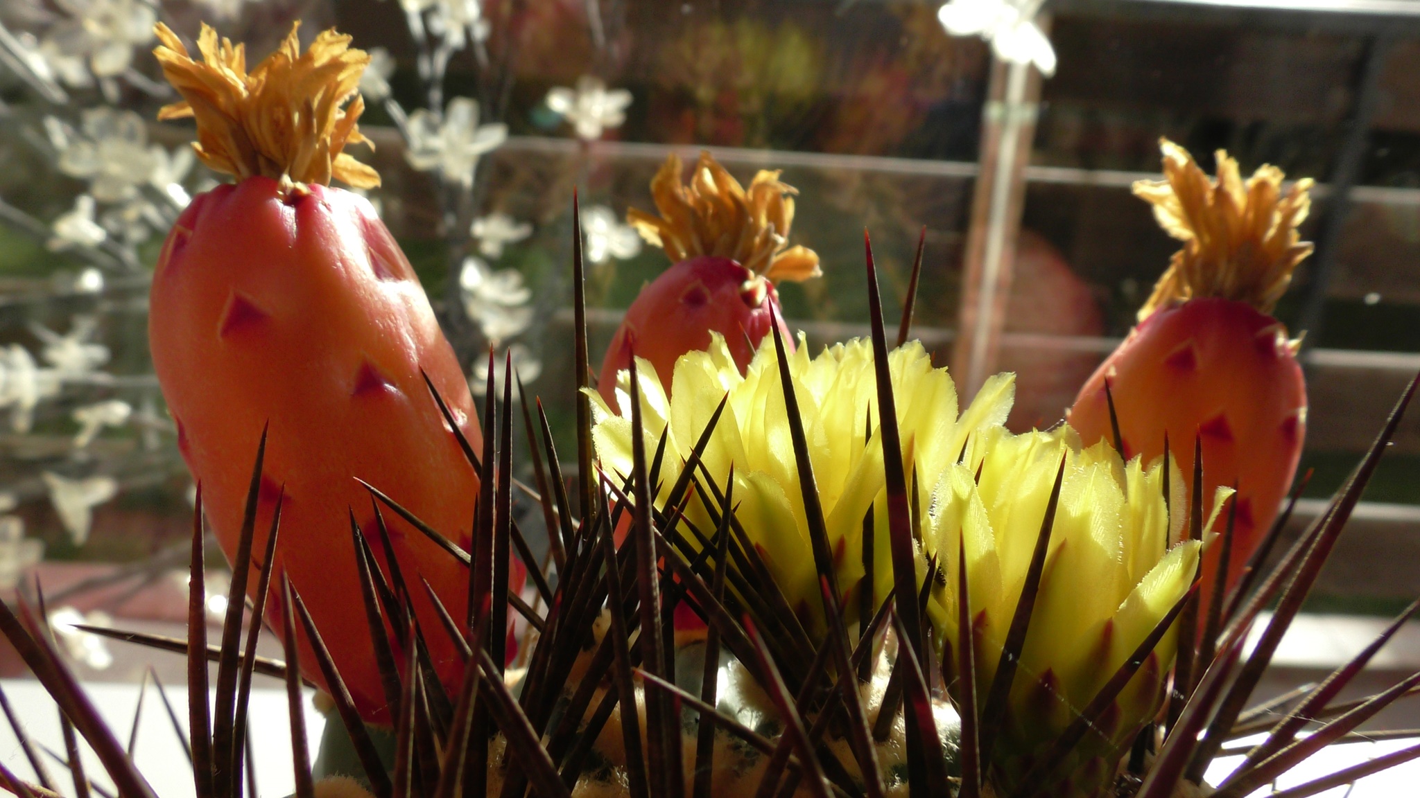 Ferocactus lindsayi -Blüten an den Weihnachtsfeiertagen zwischen den Früchten des Weihnachtsfestes vor einem Jahr