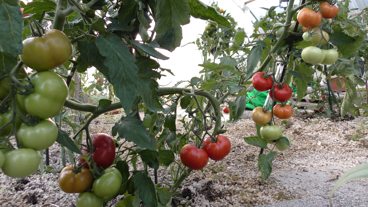 Tomaten - dornenlos und schmackhaft - "nachhaltig" sind sie, das ist heute der Schlager, gezogen im kuhmistgedüngten Bimskiesboden! "Nachhaltiger" sind sie als das Dornengestrüpp insbesondere weil sie sich von auch von grün nach rot verwandeln!