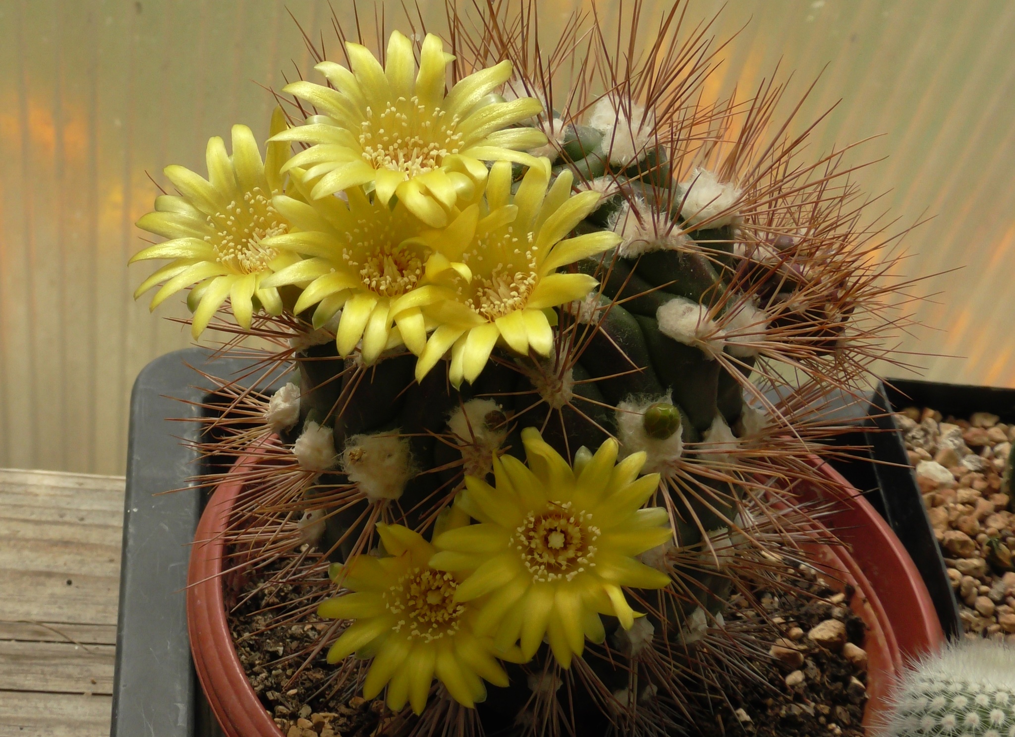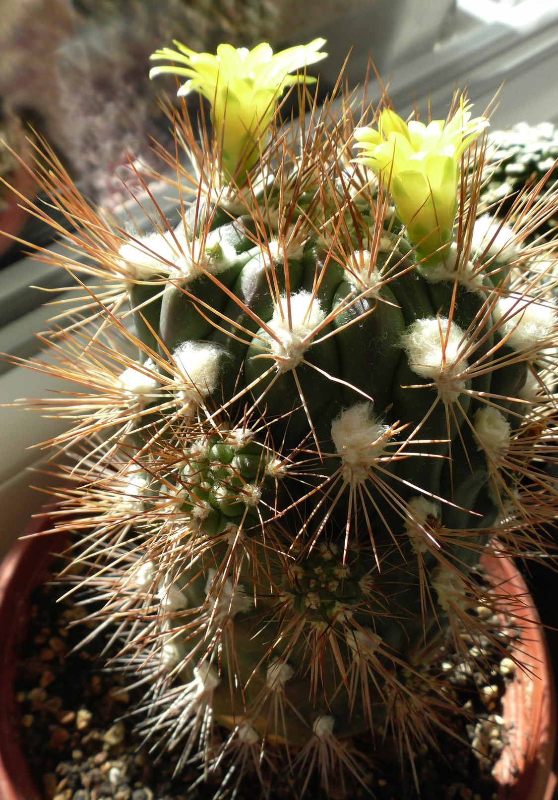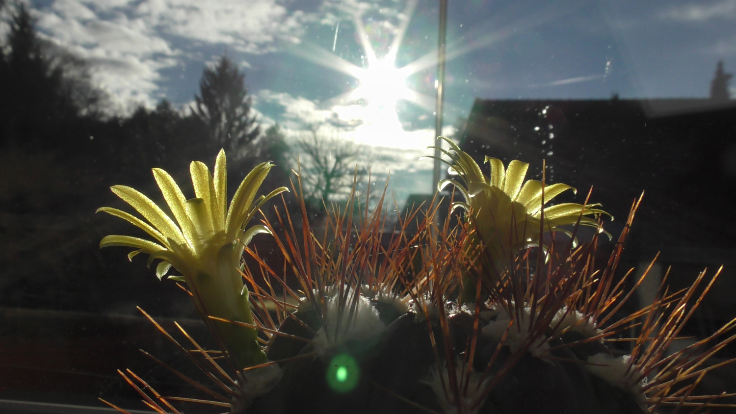 Uebelmannia flavispina blüht wieder am Heiligen Abend obwohl sie ihre Wurzeln wegen Wurzelläuse verloren hat