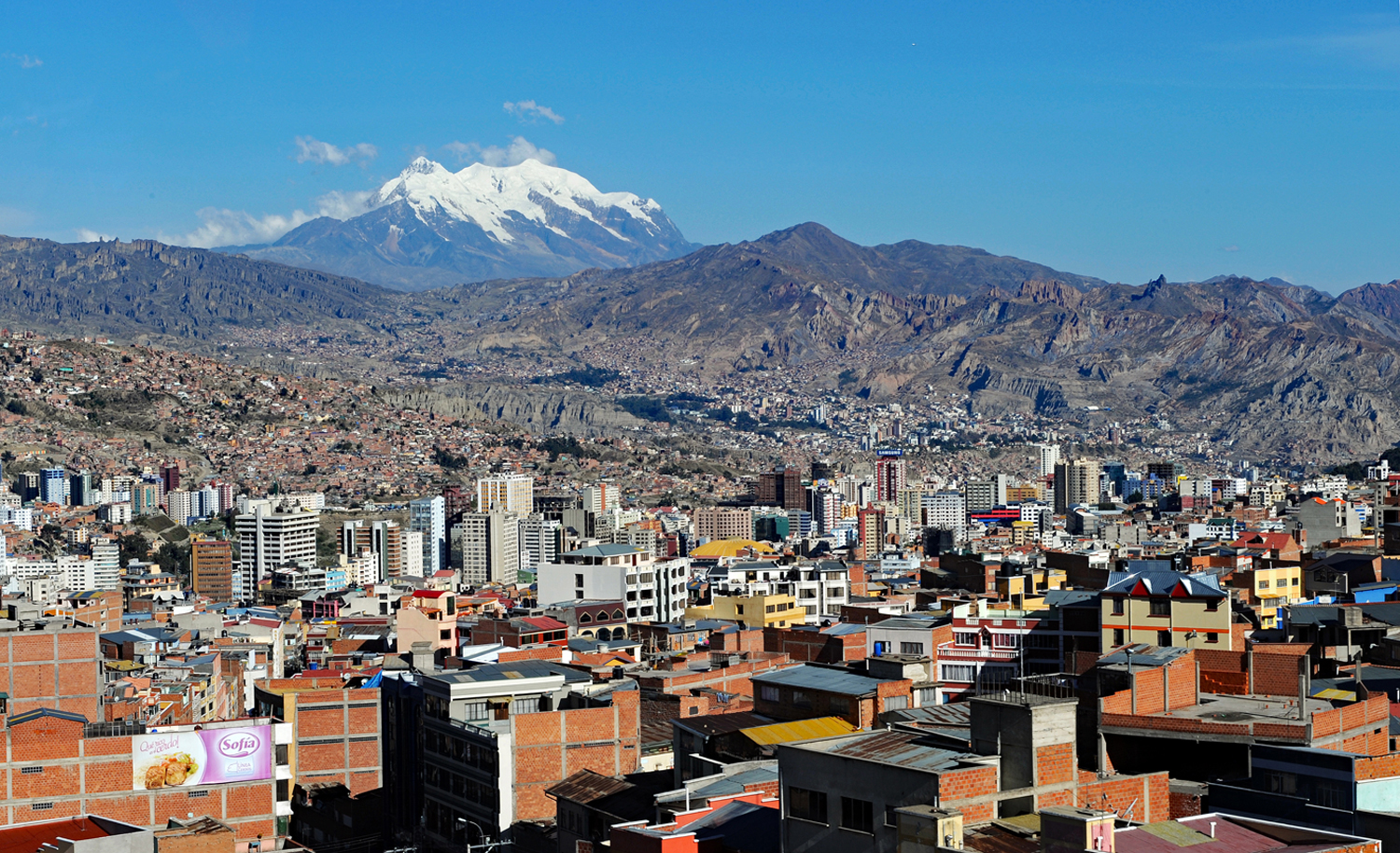 La Paz mit seinem 6439m hohen Bergmassiv Illimani. La Paz mit knapp einer Millon Einwohnern liegt in einer Höhe von 3200 bis 4100m.